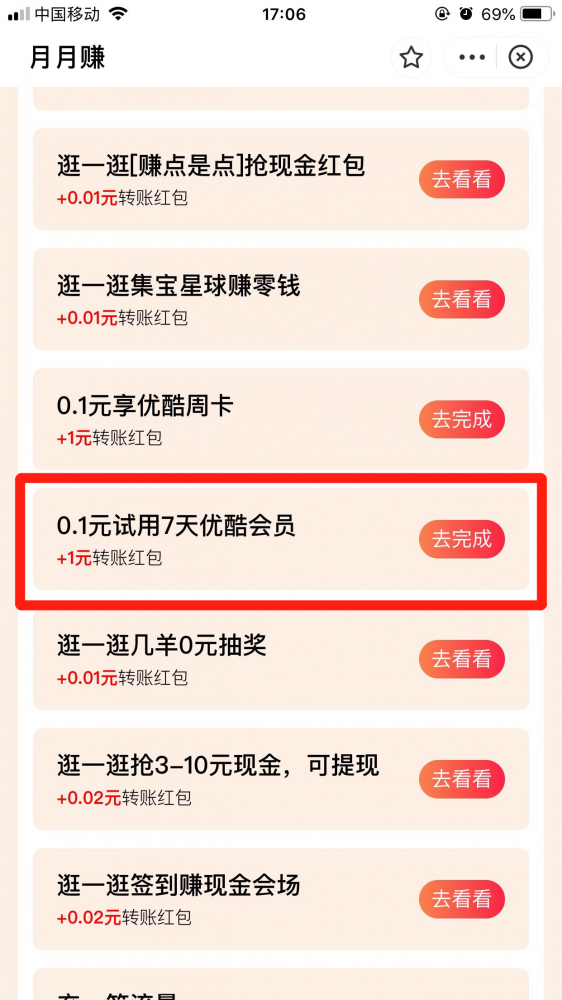 往下滑找到图片中的优酷会员领取一下1元红包