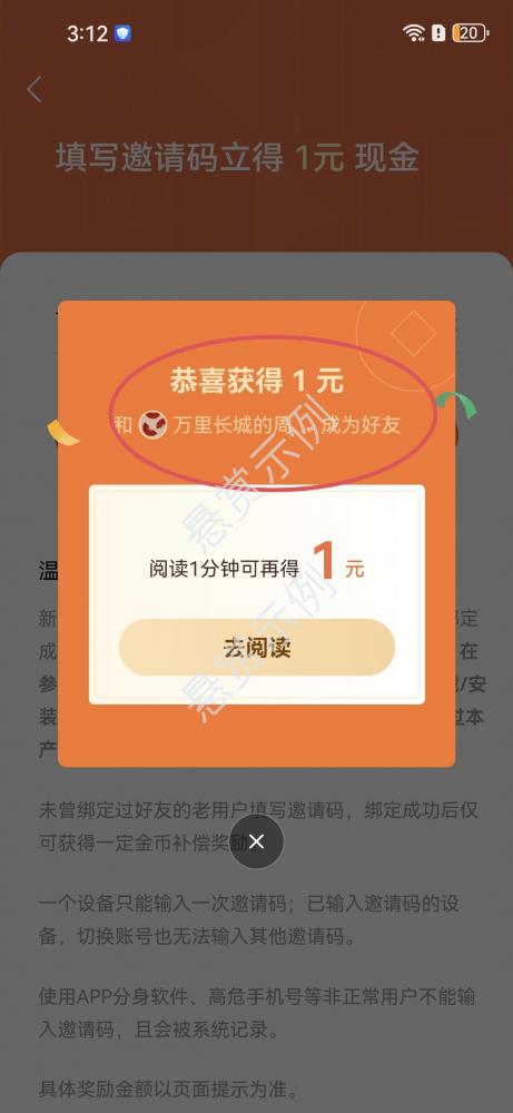 助力成功图。显示一元截图(老用户金币图不通过),再返回首页随便点一个小说阅读1分钟