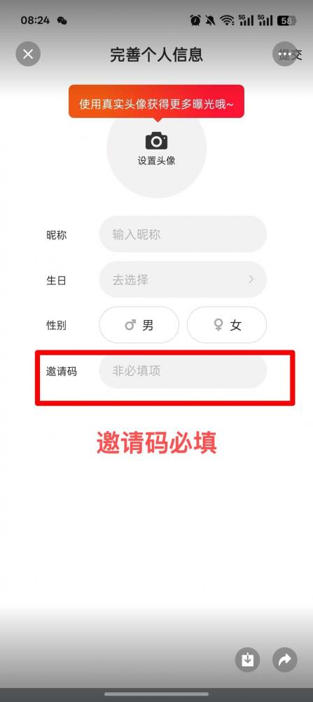 下载之后,注册时必填邀请码1ATERQGA,注册时必须填自己真实的出生年月日,不然后面的实名做不了,这一步没有填邀请码这一栏的可以放弃任务