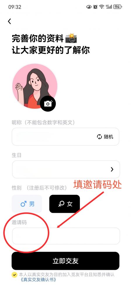 登录后在最下方粘贴上面的邀请码,性别选择女。