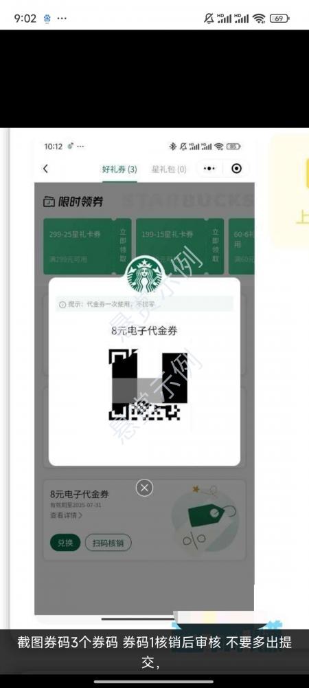 我的好礼券有三个8元的券,每个券都截图一下券码。点那个扫码核销有券码