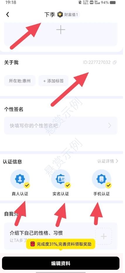 点击头像下拉截图昵称➕ID➕三个认证完成图。 缺一不可