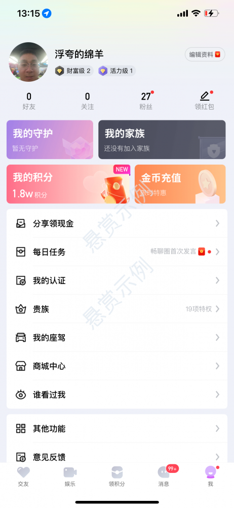 我的主页截图,这个聊天软件别人回复一条信息就有钱,回复越多一天能挣几十