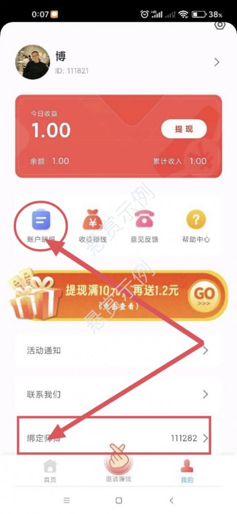 个人页面,绑定师傅的ID;111282,当天有效,满一元即可提现