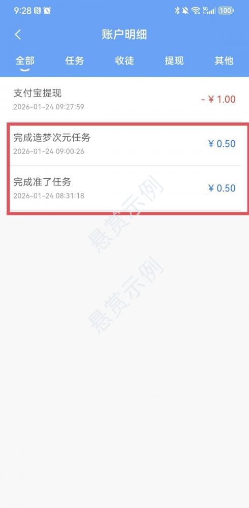 我的~账户明细,一个显示已完成,满一元就可提现,注册后当天有效