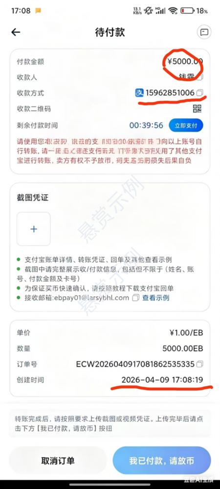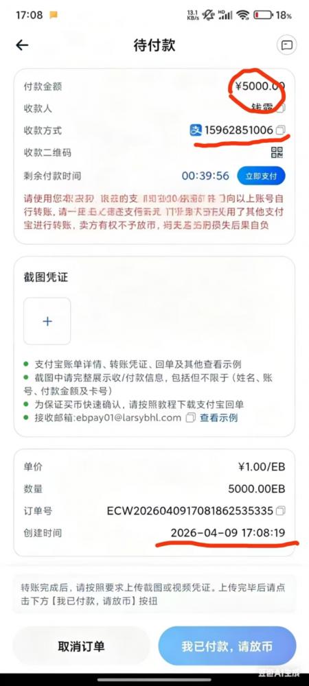 点买卖币页面选择:买入☞EB☞支付宝☞5000☞购买EB。无需付款,生成订单即可。