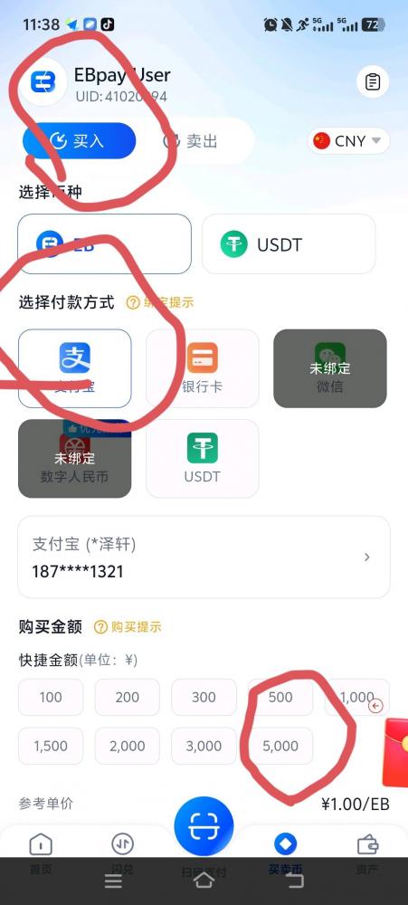 点买卖币页面选择:买入☞EB☞支付宝☞5000☞购买EB。无需付款,生成订单即可