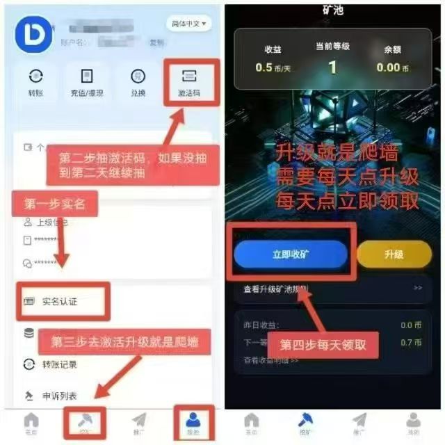 下载登录上去,先按步骤先实名,然后抽奖复制激活码激活 激活当天不能收矿,第二天可以